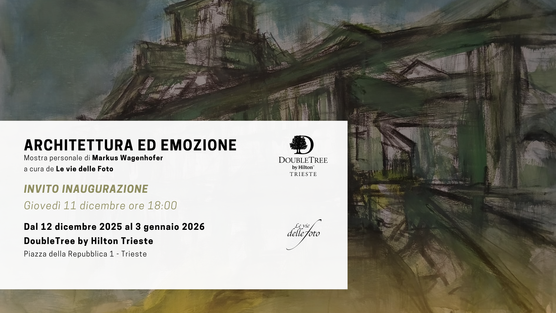 Dal 12 dicembre 2025 al 3 gennaio 2026, il DoubleTree by Hilton Trieste ospita “Architettura ed Emozione”, la mostra personale del pittore austriaco Markus Wagenhofer, a cura di Le Vie delle Foto.